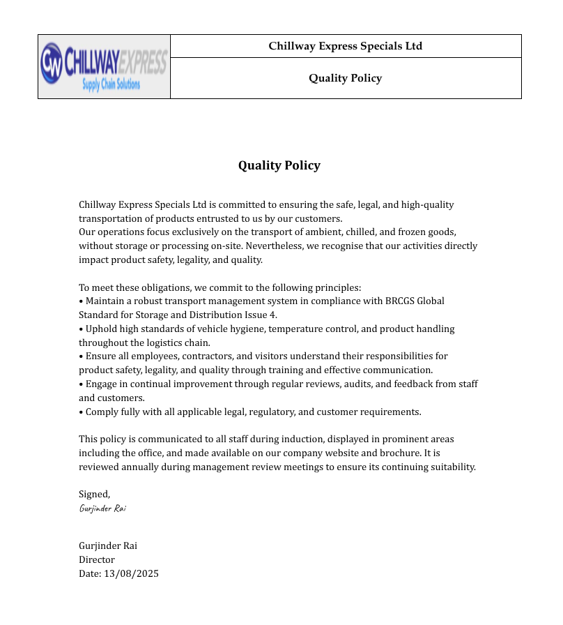 Chillway Express are full members of the Freight Transport Association (FTA), one UK's largest trade associations. We are also members of Logistics UK.